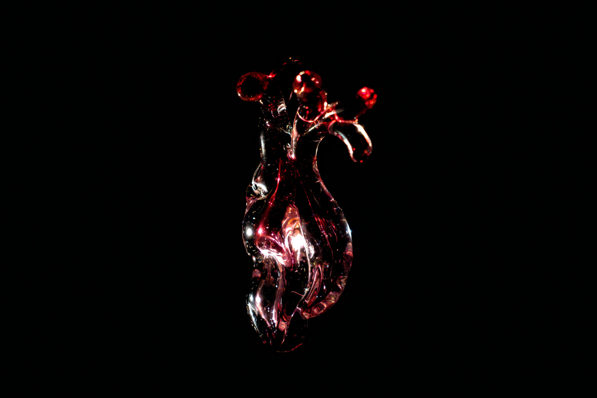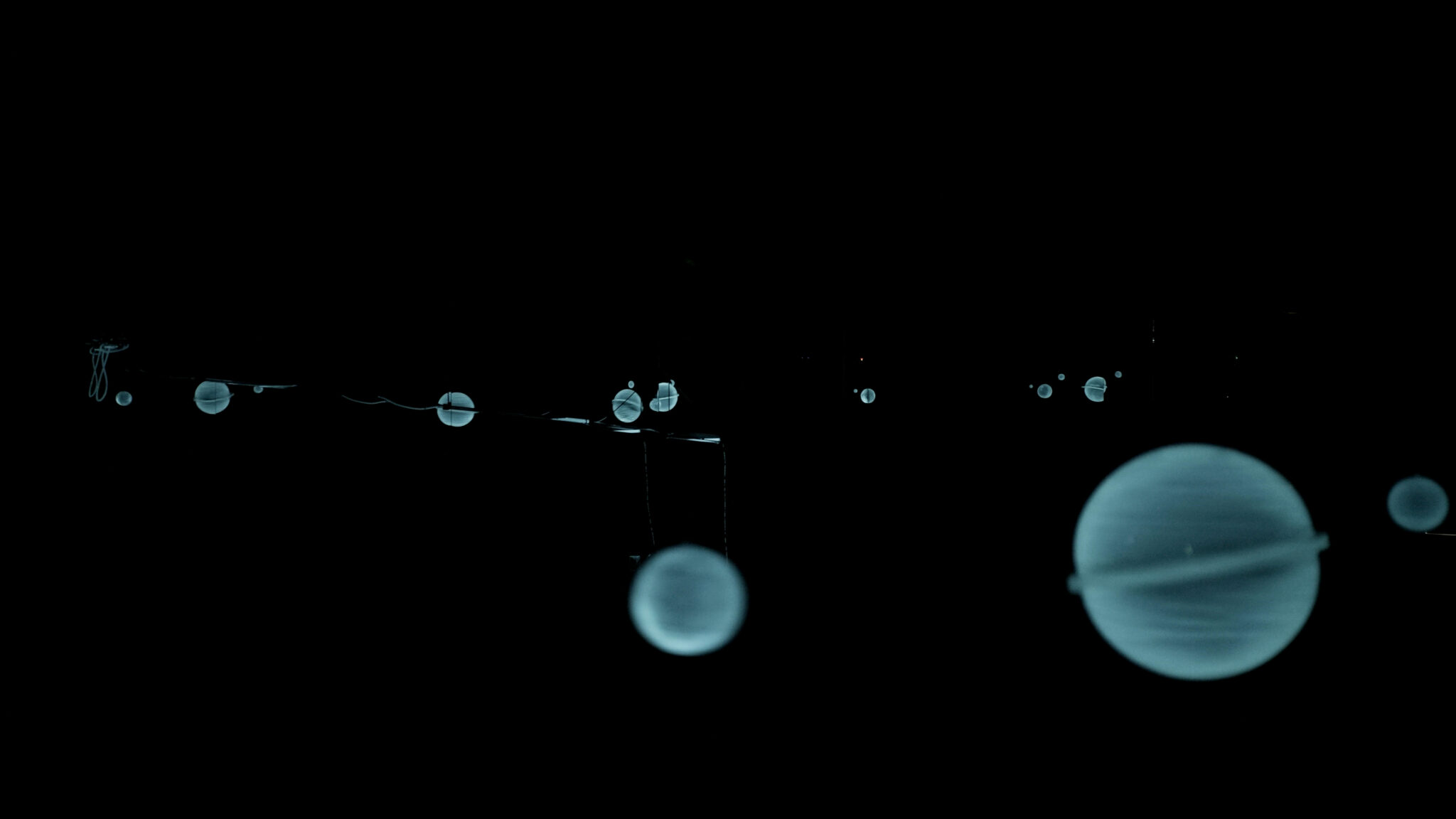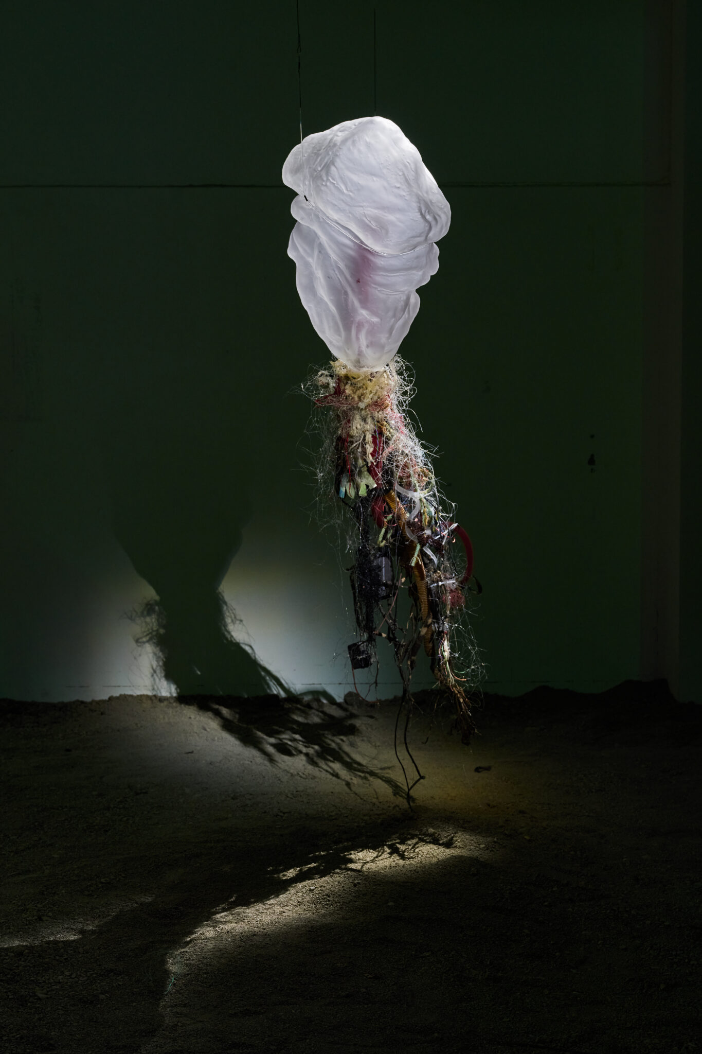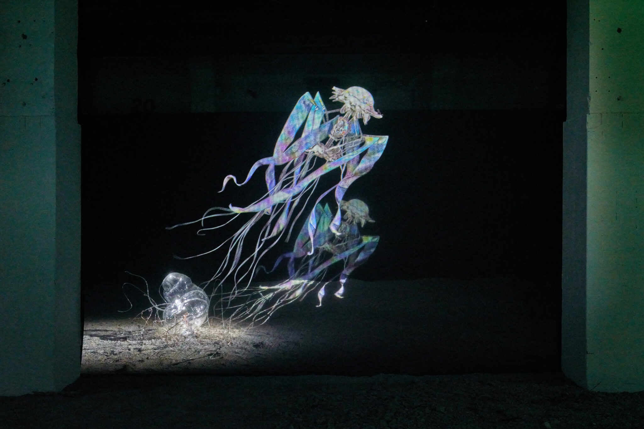 Plus loin, dans les profondeurs, le visiteur pénètre dans la Zone de minuit d’Ugo Schiavi, là où la lumière disparaît totalement, au-delà de 1000 mètres de profondeur. C’est l’espace des créatures impossibles : méduses fantômes, poissons aux dents translucides, organismes dont 90 % sont encore inconnus. Les vidéos et sculptures de Schiavi, flottantes et mutantes, semblent naître de ce limon cosmique où se rencontrent mythologies, futurs effondrés et déchets remontés de la surface.